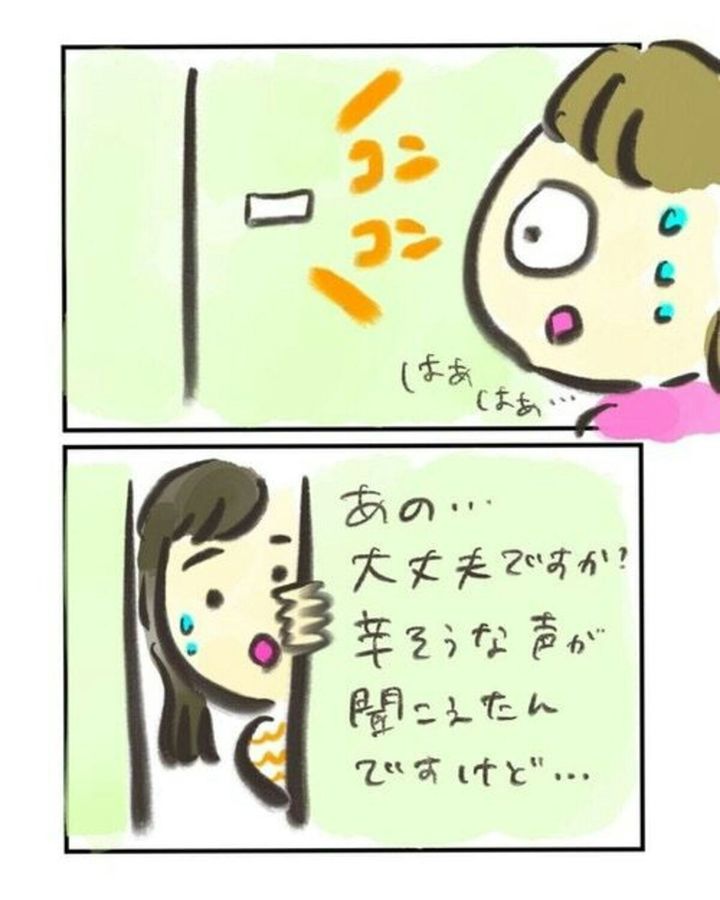 破水をしてパニックになっていたとき、ドアがノックされ、つらそうな声を聞きつけた女性が声をかけてくれました。