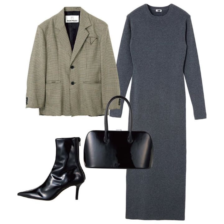 ジャケット¥39,600(プランクプロジェクト/プランクプロジェクト 青山店)、ニットドレス¥33,000(エイチ ビューティー&ユース)、バッグ¥52,800(ヴァジック/トゥモローランド)、ブーツ¥47,300(ピッピシック/ベイジュ)
