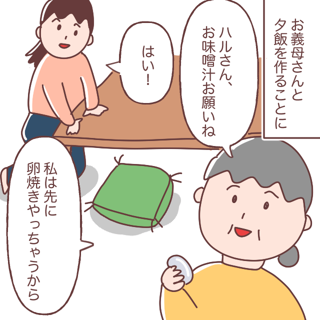 その後、義母と夕飯を作ることになったハルさん。「ハルさん、お味噌汁お願いね。私は先に卵焼きやっちゃうから」「はい!」義母と手分けしながら順調に夕飯の支度を進めます。