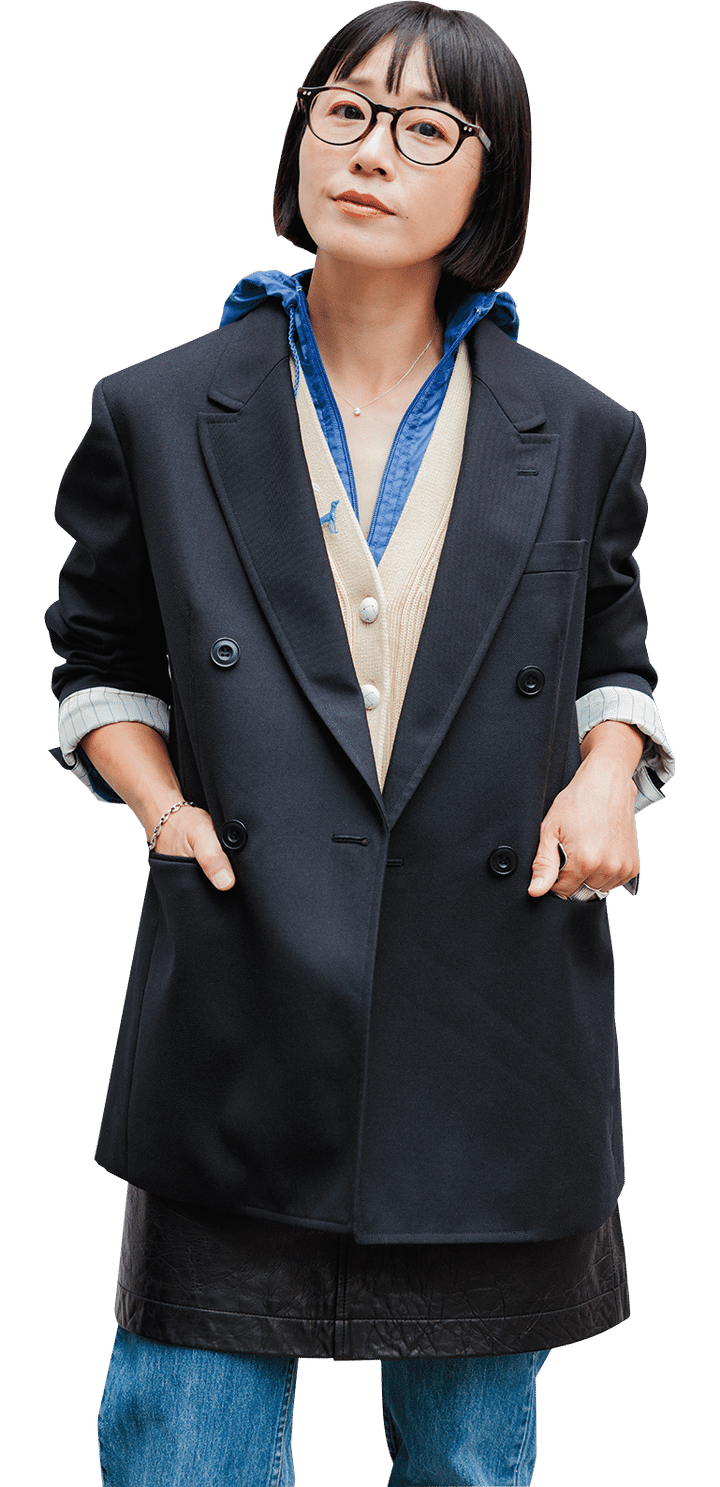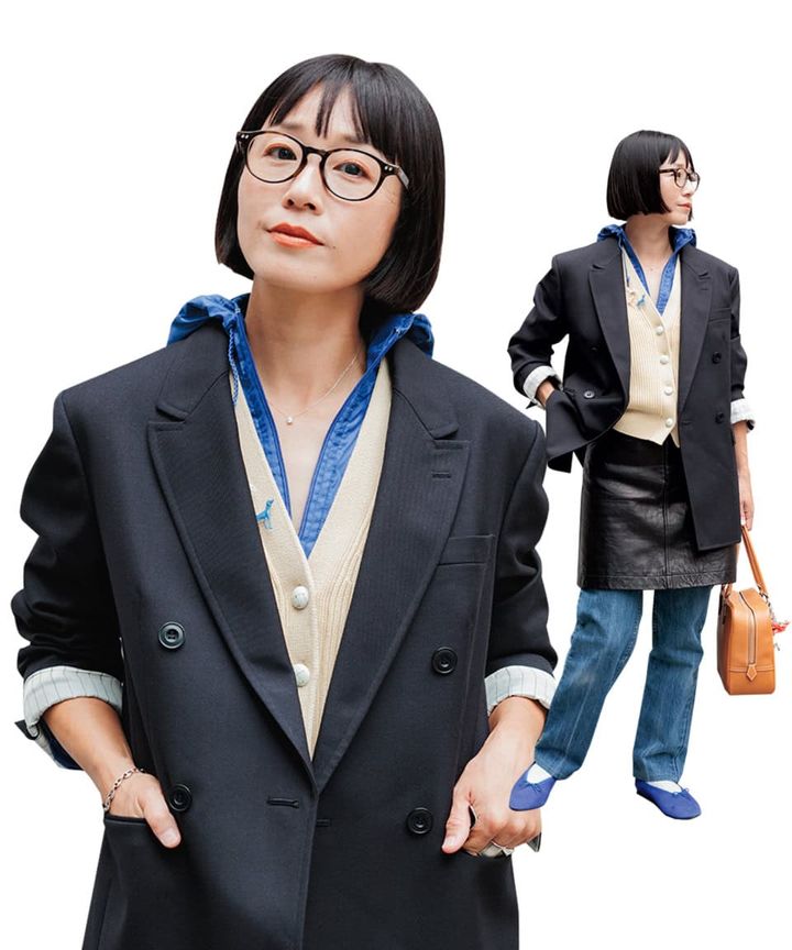 テーラードジャケットをナイロン素材でハズすこなれテク満載スタイル【遠山涼子さんの私服スナップ】
