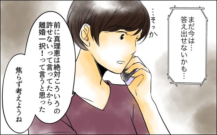 真理恵は「一度夫と話させてもらいます」と気丈に返信しつつ、内心はショックでいっぱいでした。そして、友人の美緒に電話で相談すると「真理恵はどうしたいの?」と聞かれました。