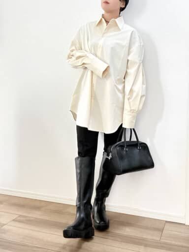シャツにレギンスとロングブーツという旬なスタイリングをしたかったので、筆者はあえてLサイズを購入。オーバーサイズだけれど、ずるっと着られた感じの出ないシルエットなので、まさに大人っぽく着こなせますよ。
