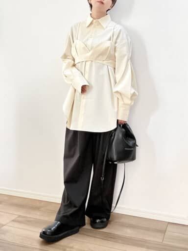 大きめなサイズ感のシャツですが、付属のビスチェが胸元でキュッと引き締めて目線を上げてくれるので、ルーズながらも女性らしいシルエットで着こなせます。