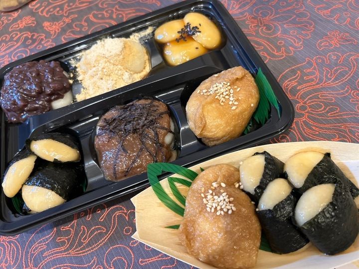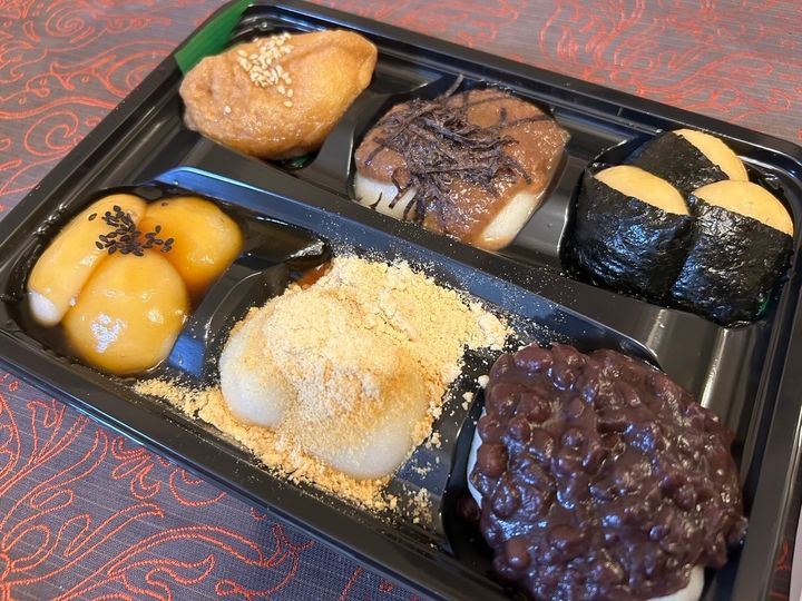 あんこ、きなこ、みたらし、いなり(1つ)、磯部、五平餅の6種が3個ずつ入っているセットを予約☝️