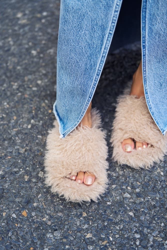 今季ぜひ挑戦したい、上下揃いで着るデニムのセットアップコーデ。スカートのカーヴィなシルエットと深めのスリットのおかげで、ボーイッシュになりすぎず上品にまとまります。モコモコファーのサンダルで、秋気分を満喫♡