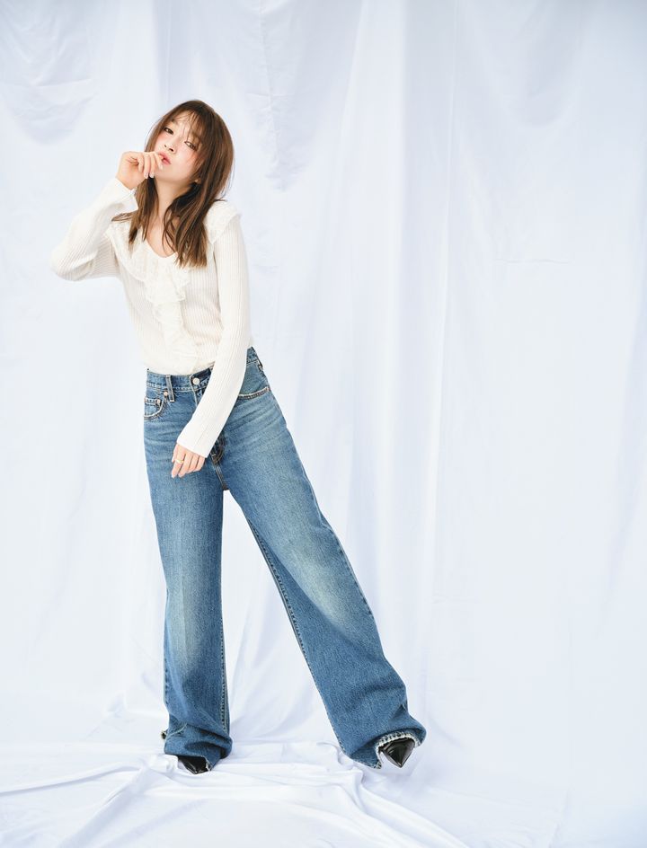 上西星来。ar10月号より デニム¥14,300/リーバイス® (リーバイ・ストラウス ジャパン) トップス¥10,450/レイ ビームス(レイ ビームス 新宿) パンプス¥9,900/チャールズ&キース(チャールズ&キース ジャパン) リング¥9,900/シーエヌ(ロードス)