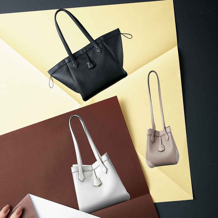 研ぎ澄まされたシンプルさでどんな着こなしにも格を与えてくれる「FENDI Origami」は、折り紙のように折り畳んでシルエットが変化する様から名づけられた新名品バッグ。マグネットを中央で留めると巾着型バッグに、両側の短いショルダーストラップを引くとトートバッグに、とスタイルに合わせて形を変えられる、私たちにふさわしい新アイコンバッグです。