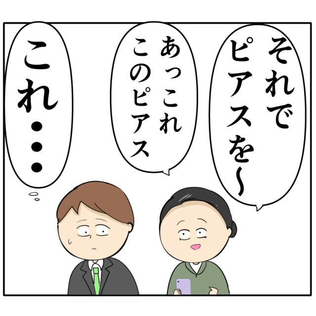「それでピアスを~」とふり子さんから聞いた話を詳しく村上くんに話すサワさん。良し男さんがふり子さんに贈ったピアスもちゃっかり写真に収めていて「あっこれ、このピアス」と村上くんに見せました。写真のピアスを見た村上くんは「これ・・・」と見覚えがありました。