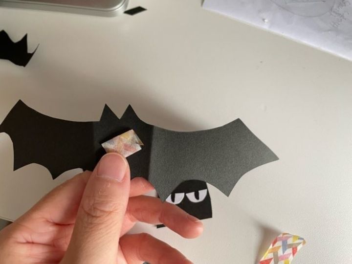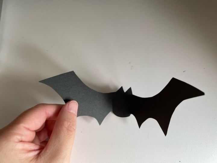 ハサミで切り取り、両羽に折り目をつけてコウモリの完成です。羽に折り目をつけることにより、より立体的になります。