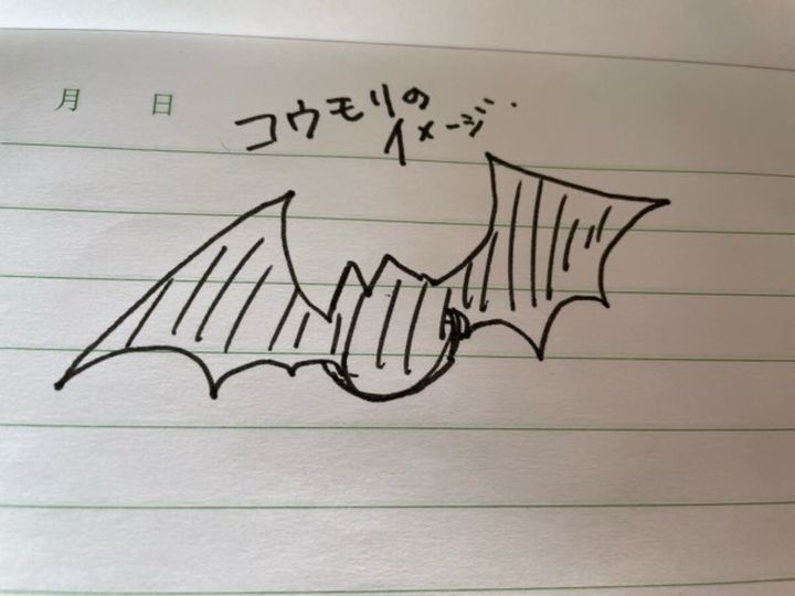 まずはコウモリの形をイメージするために、紙にコウモリを描いてみました。ハサミでカットするので、複雑な形にしないことがポイントです。