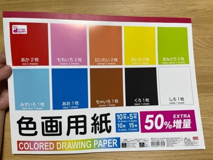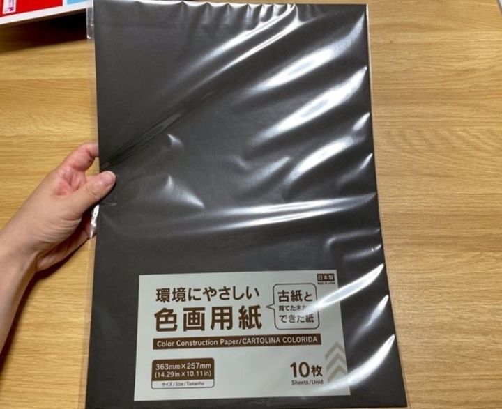 今回は近所の100均に売っている黒い画用紙10枚入りと色画用紙10色入りを購入しました。2種類の購入なので、合計金額は220円(税抜)。