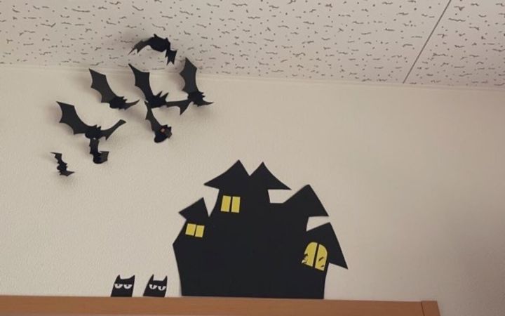 黒い画用紙で切り絵のようにすると、なんとなくそれっぽくかっこよく見えますよね。まだ、ハロウィーンには時間があるので、魔女の切り絵風やいろいろ追加して、見て楽しみたいです。