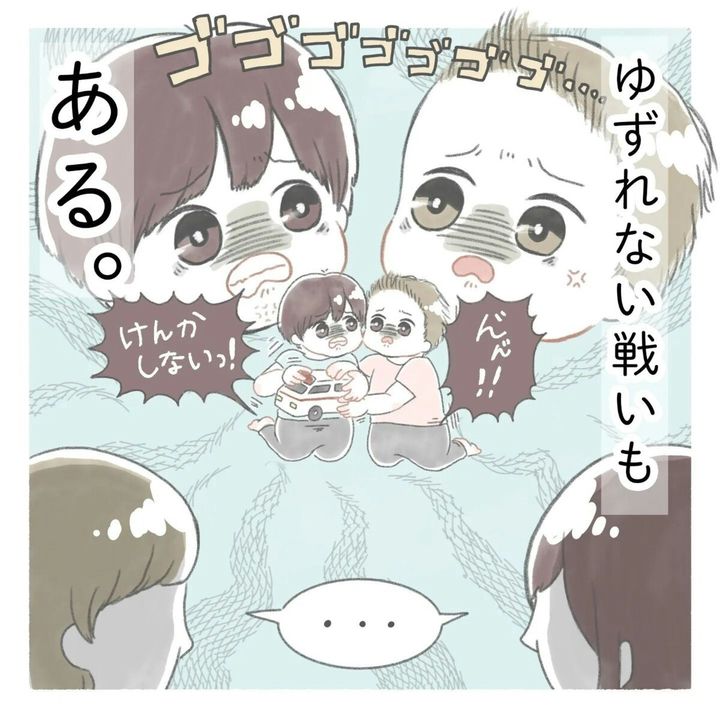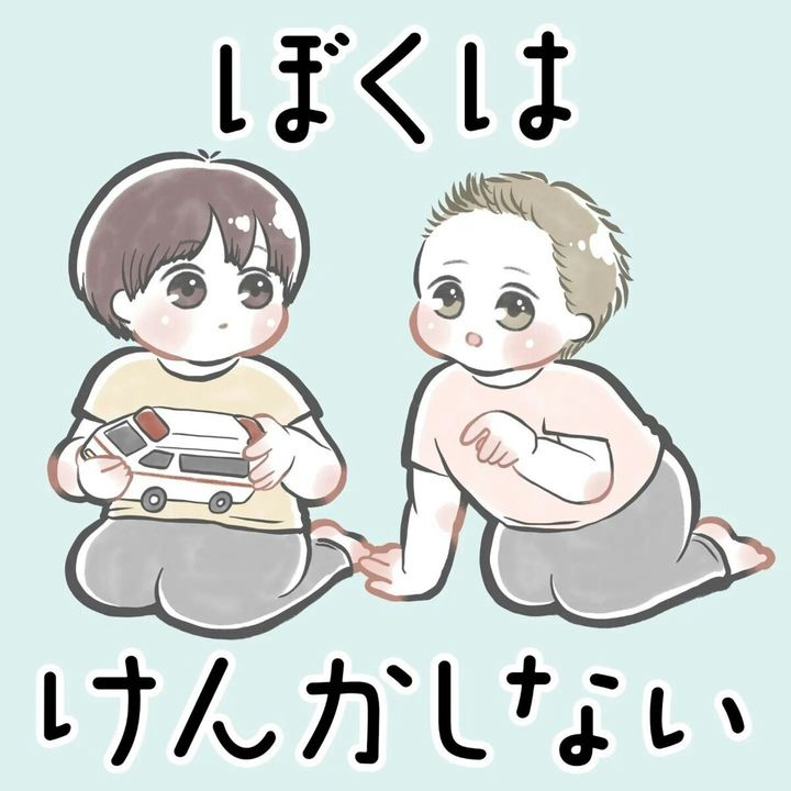 ふたばくんの「けんかしない」に感心したのもつかの間、ジリジリとにらみ合いの戦いが始まってしまいました。「それけんかだよ」というママたちの声が聞こえてくるようですね。ママとの約束もおもちゃも守りたいふたばくんに、ほっこり癒やされるお話でした。