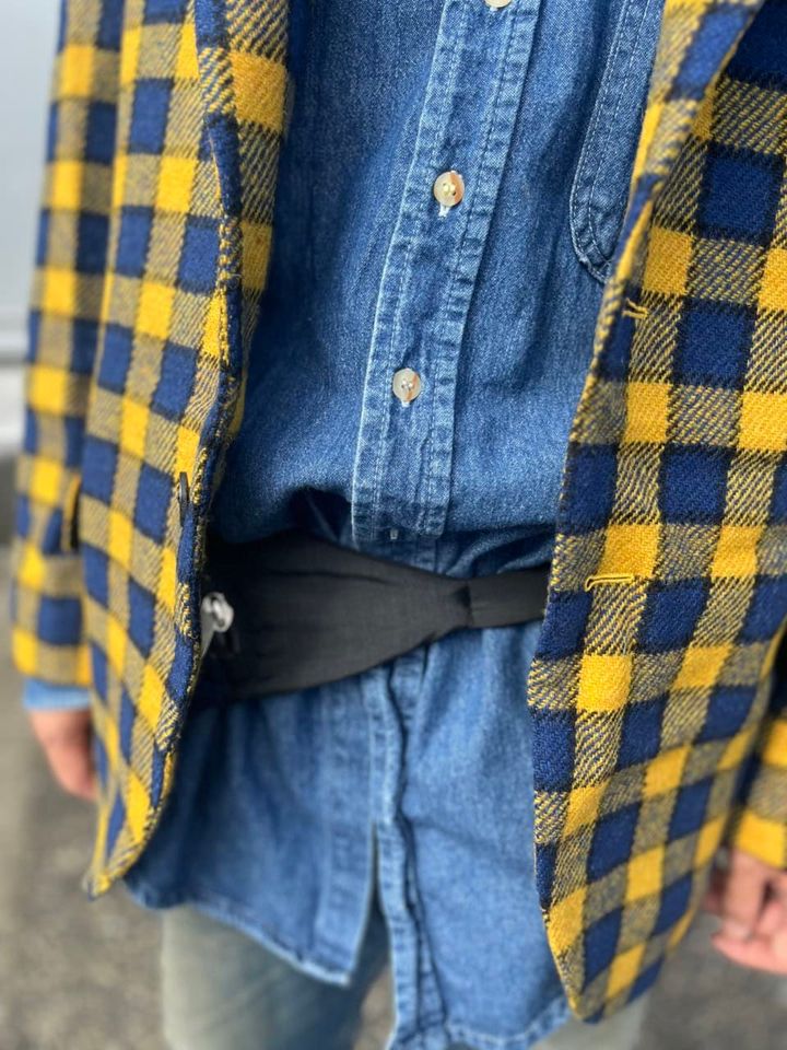 ウエストポーチでデニムシャツをウエストマークするアイディアが斬新