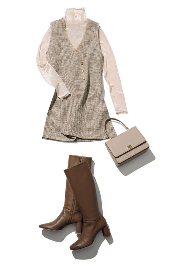 ミニワンピトレンドのなかでも勢いがあるジャンスカ。インするトップスの選び次第でクラシカルに振りやすいから、簡単にコーデが大人っぽくキマります♡ ベロアカットソーの光沢でリッチ感を後押し!