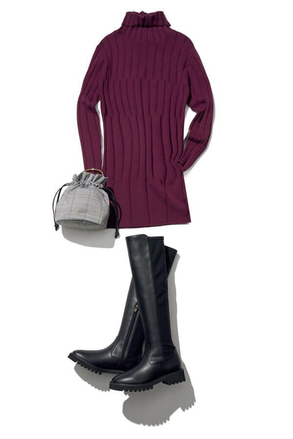 柔らかな風合いとシルエットで、上品に女っぽさを高められるのがニットワンピの利点。キリッと印象が引き締まる色柄を選びつつ、クラシカルな小物合わせでムードを添えて。黒のニーハイブーツでもバランスアップを後押し♪