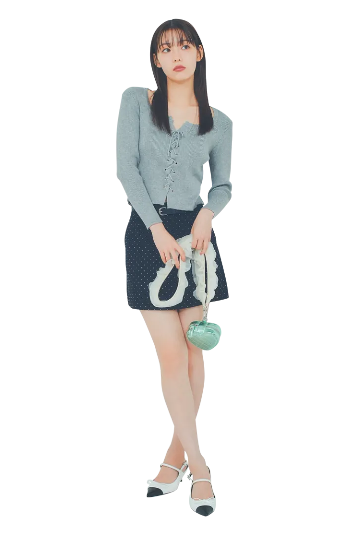 グレーレースアップニット 2,199円/W♥C ビジューつきスカートとベルトのセット 3,299円/PHILLY ハートバッグ 10,450円/ダイアナ(ダイアナ 銀座本店)ミュール 9,900円/チャールズ&キース(チャールズ&キース ジャパン)