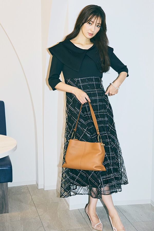 シアーチェックのドッキングスカートが黒ワンピに奥行きをプラス。ビッグカラーのケープ襟で華やかさを演じつつ、締め色でオフィス向きなルックスに。