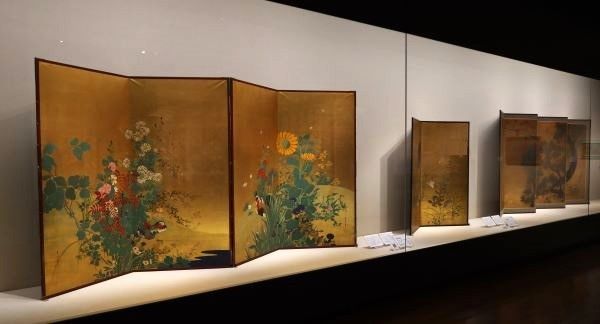 伝 俵屋宗達(でん たわらやそうたつ)《槙楓図》(右)、酒井抱一(さかいほういつ)《秋草鶉図》重要美術品(中央)、鈴木其一(すずききいつ)《四季花鳥図》(左)。 装飾性を際立たせる金地を背景に草花、花鳥を意匠的に配して描いた華やかな琳派の屛風図です。