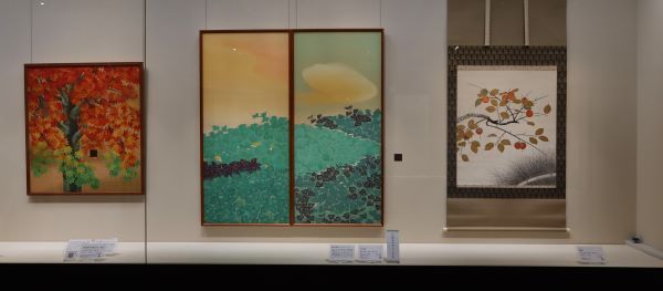 右から、小林古径 《秌采》 1934(昭和9)年 紙本・彩色、富取風堂 《丘の畑》 1939(昭和14)年 絹本・彩色、山口蓬春 《新宮殿杉戸楓4分の1下絵》 1967(昭和42)年 紙本・彩色 すべて山種美術館蔵