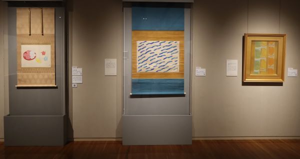 手前、《竹》 1957(昭和32)年 紙本・彩色 個人蔵他、特別展「没後50年記念 福田平八郎×琳派」展示風景 山種美術館