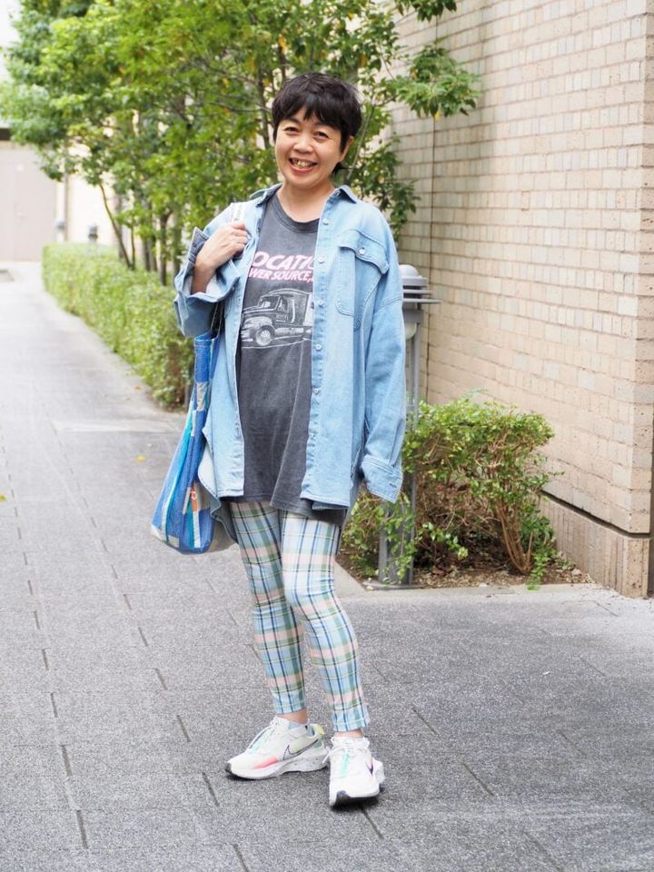 オーバーサイズのヴィンテージ風Tシャツにデニムシャツをオン。ゆるっとしたシルエットに下半身はあえてレギンス1枚というメリハリのある着こなしがポイントです。「ファッション雑貨のバイヤーとして日々さまざまなアイテムを見ているせいか、ほかにはないものや着こなしに惹かれがち。常にときめきを大事にするようにしています」。MURAKKOIさんが着てこそ輝く、オンリーワンのスタイリングがステキ。