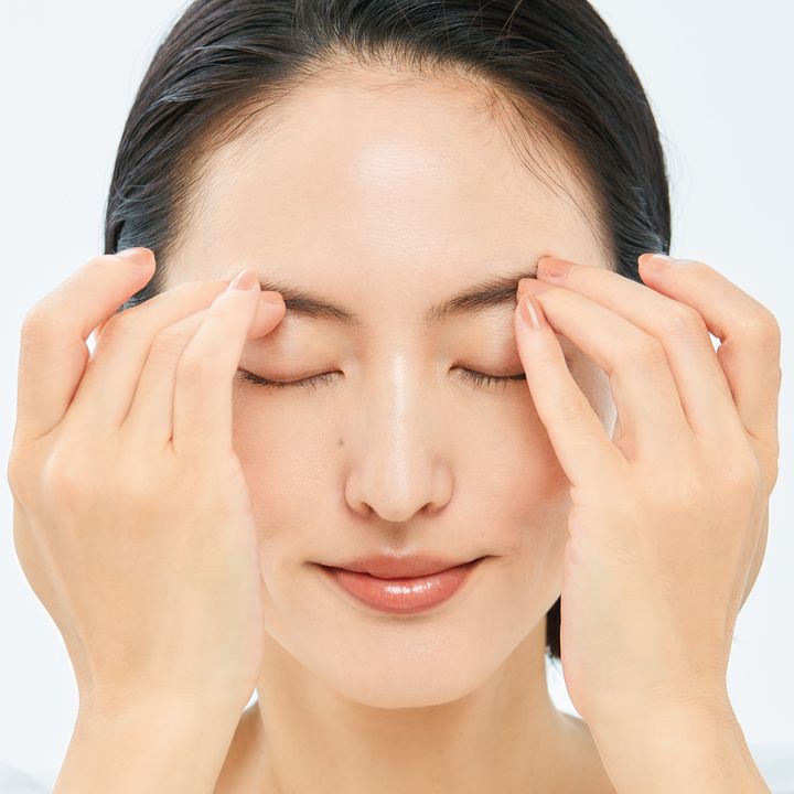 目元には力が入りがちで硬くなっています。眉周りの筋膜をリリース。眉の毛の上に中指と薬指を置き、シグザグと眉を揺らしながらほぐします。