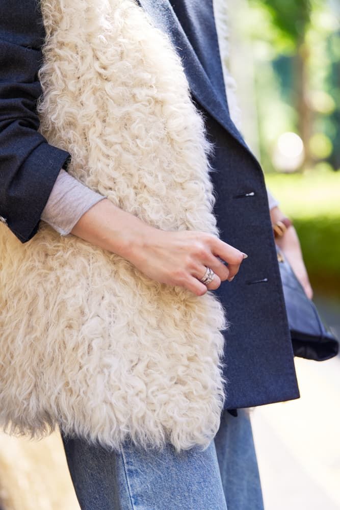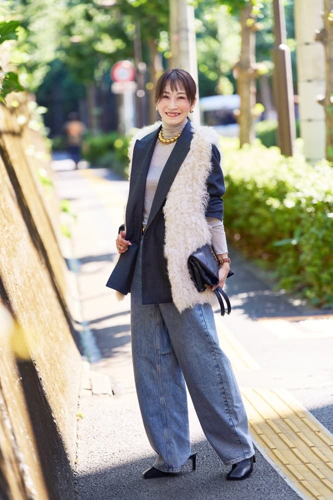 上質なウールヘリンボーン素材のジャケットは暖かく、冬の初めにもコート要らずで楽しめます。ファーベストを重ねてデニムスタイルに可愛らしさをプラスすれば、甘ニッシュコーデに!シアーなインナー、ヘリンボーン、カーリーなファー、と異なる素材感を重ねてコーデに奥行きを。