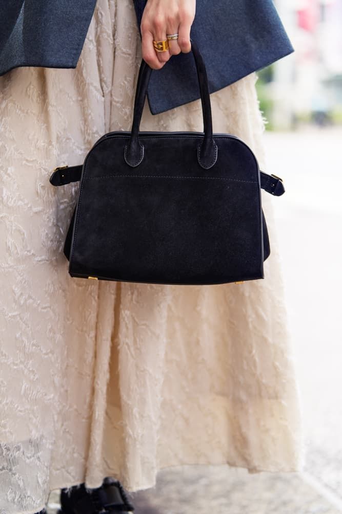 大好物のドラマティックスカートはもけもけのシャギーで今年らしさ抜群!糖度高めなアイテムですが、ハンサムなジャケットが甘辛バランスを中和してくれます。黒のブーツとスウェード素材のバッグを合わせ、季節感を意識しながら全体を引き締めました。