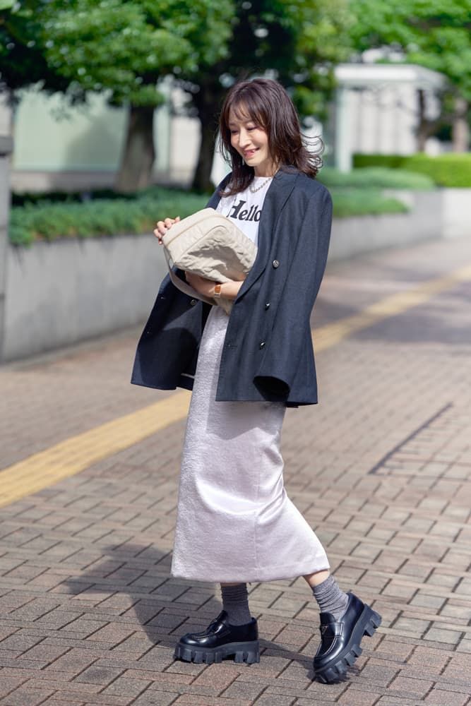 やっと来た秋!出番を待っていたカオスのジャケットが主役のコーデです。まだ少し暑いから、通年活躍アイテムのロゴTとボトムはサテンのナロースカートで涼しさもキープ。厚底のおじローファーにソックスを合わせてショートブーツ見えを狙って。