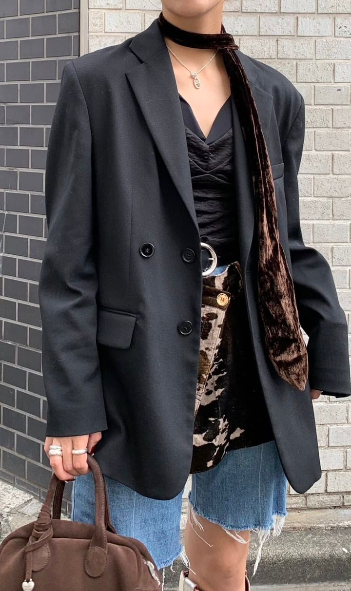 「ベーシックなジャケットなので、小物使いで遊び心をプラスしました。切りっぱなしのハーフデニムやウエスタン調のブーツを合わせて、キレイめなジャケットを自分らしく着こなしています」