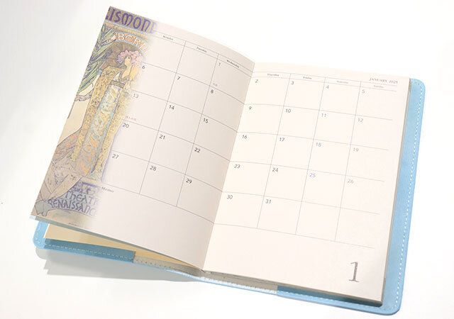 まずはマンスリースケジュールがお目見え。左側には、ミュシャ独特の美しく神聖な印象の女性が描かれています。