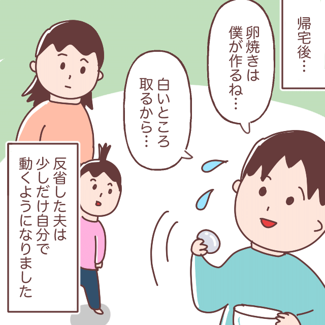 そして帰宅後のこと、「卵焼きは僕が作るね・・白いところ取るから・・」反省したタイチさんは、少しだけ自分で動くようになったのでした。