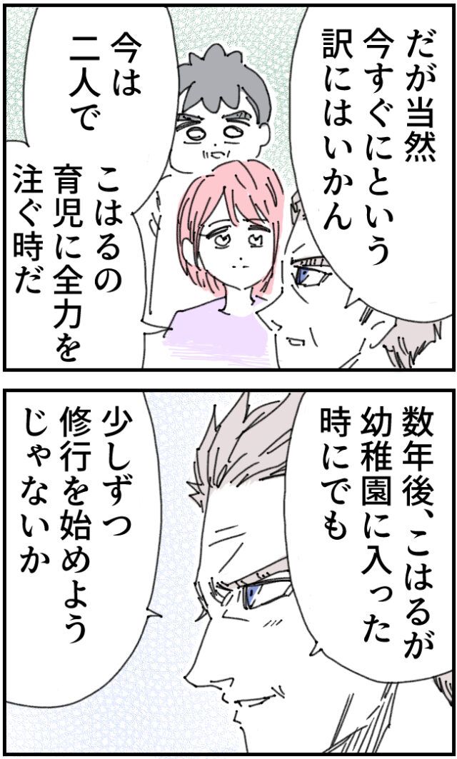 かおりさんの修行を許可してくれたお父さんですが、「だが当然今すぐにという訳にはいかん。今は二人でこはるの育児に全力を注ぐ時だ。数年後、こはるが幼稚園に入った時にでも少しずつ修行を始めようじゃないか」と、今は育児に専念するときだから修行は数年後からと言ってくれました。