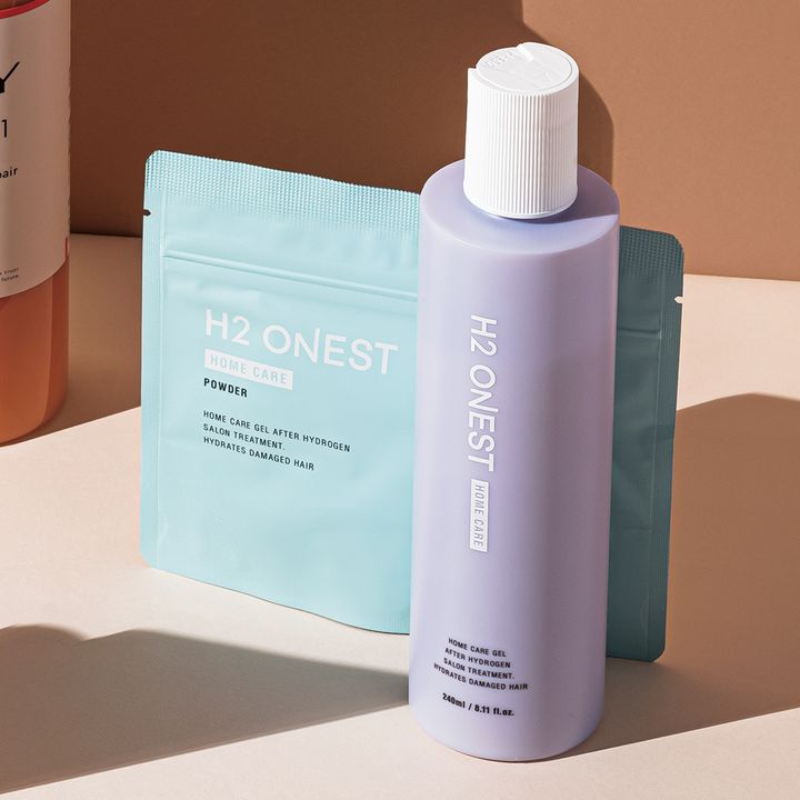 髪の酸化を除去。週に1~2回トリートメントに水素パウダーを混ぜて使用。髪にみずみずしさとハリコシを取り戻す。トリートメント240gと水素パウダー8包入り ¥8,800(ONEST)