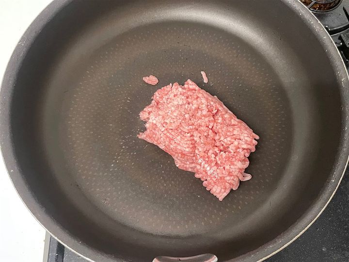 1. フライパンに油適量(分量外)を引いて中火にかけ、合い挽き肉を入れて炒めます。