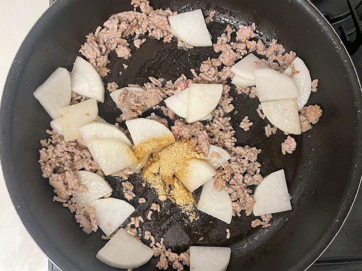 2. 軽く火が通ったら端に寄せ、空いたスペースに大根を入れ、肉の脂をまとわせる。
