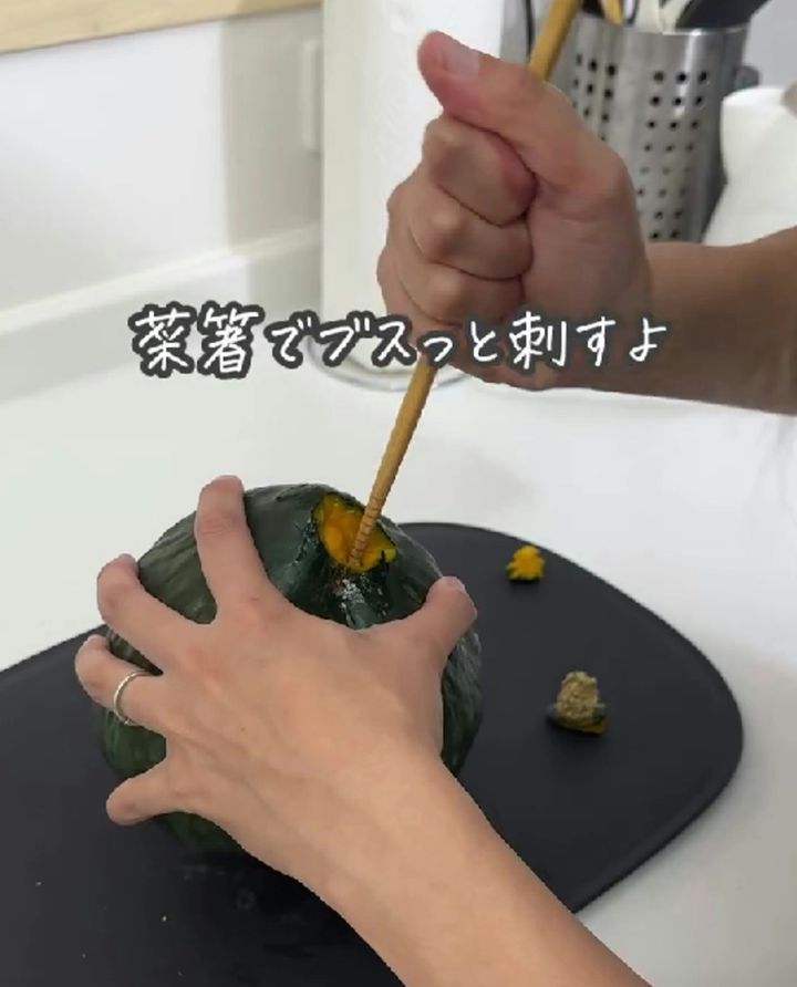 菜箸でかぼちゃを刺し、包丁で切れ込みを入れます。