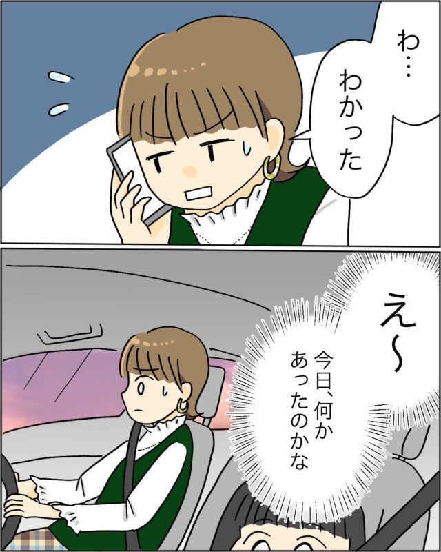 ママさんは「わ・・・わかった」とだけ返事をし、急いで帰ることにしましたが、帰りの運転中、頭の中は「え~今日、何かあったのかな」と自分が予定を忘れているのではないかと不安になるのでした。