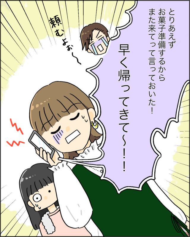 パパさんは「とりあえずお菓子準備するからまた来てって言っておいた!早く帰ってきて~」とママさんに伝えました。