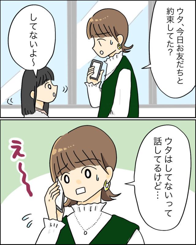 ママさんがウタちゃんに「ウタ、今日お友達と約束してた?」と確認すると、ウタちゃんは「してないよ~」と覚えがない様子でした。