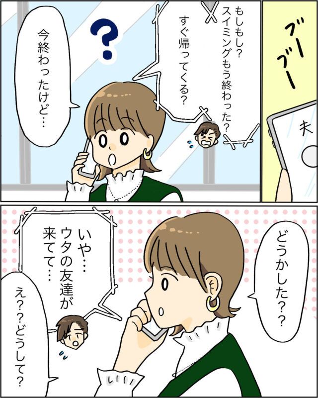 「もしもし?スイミングもう終わった?すぐ帰ってくる?」となんだか焦った様子です。