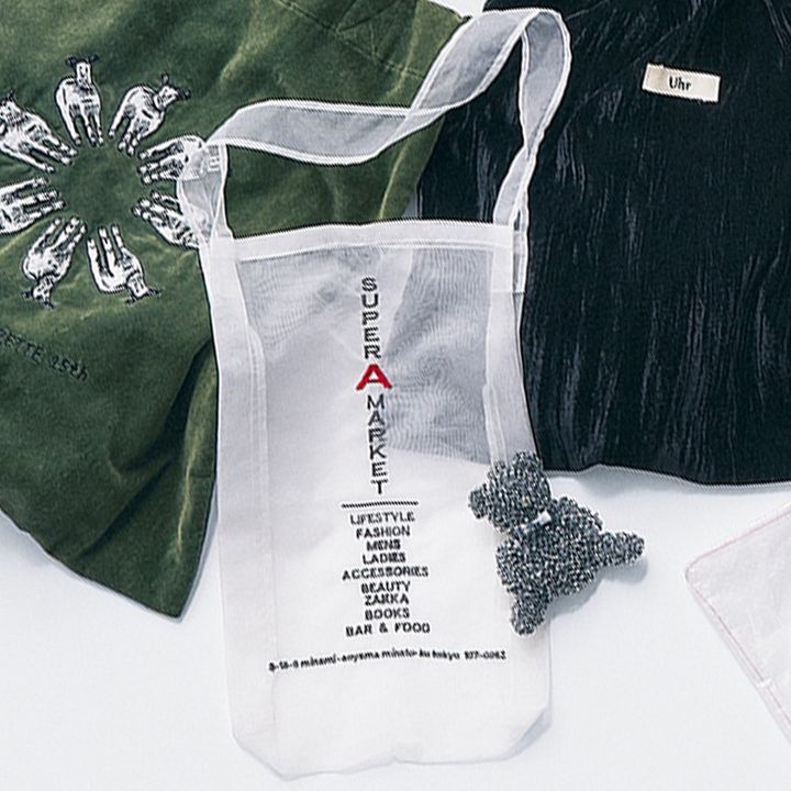 ロゴを刺繡した透け感のある素材は繊細さがありながらも耐荷重量にも優れる逸材♡ バッグ[H33×W19.5×D5cm]¥5,830(SUPER A MARKET/ランド オブ トゥモロー)ベアーチャーム¥28,600(アンテプリマ/ワイヤーバッグ/アンテプリマジャパン)