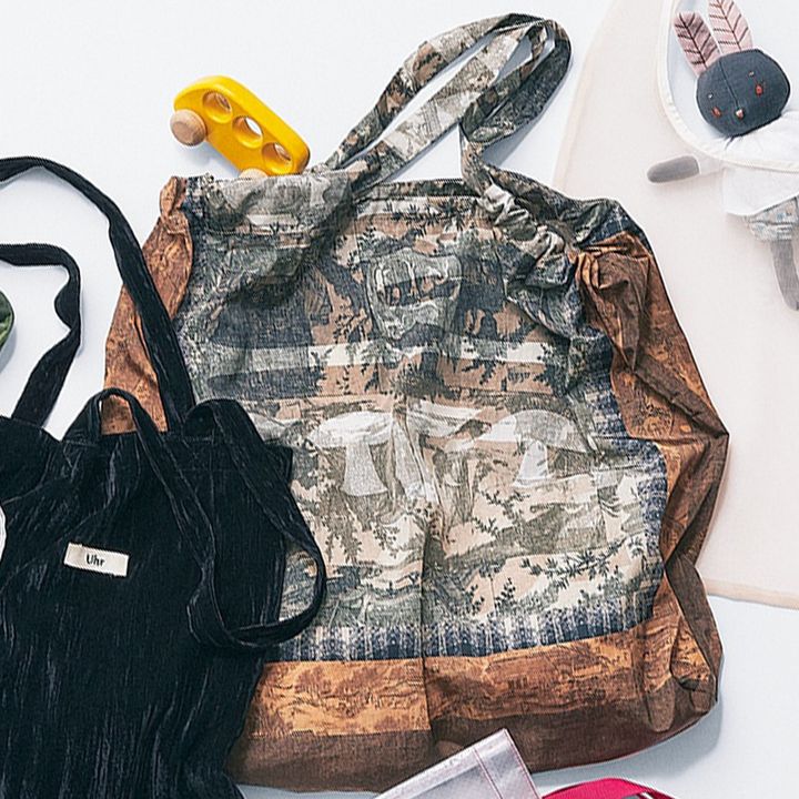 去年ローンチしたばかりの新ブランド。スカーフのような生地感で軽量。 バッグ[H48×W56×D10cm]¥38,500(ピエール・ルイ・マシア/ピモンテ)木のバス¥3,300リングカード¥2,200(ボーネルンド)