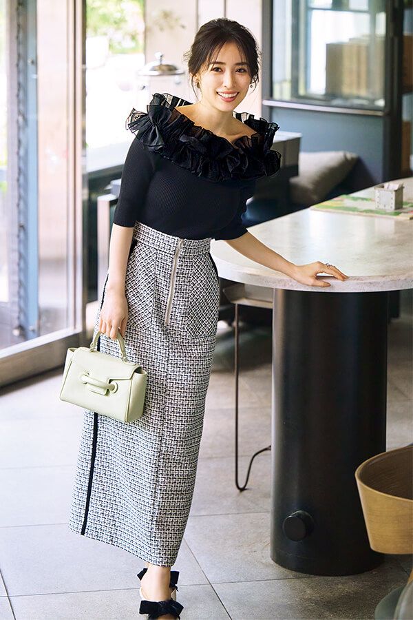 フリルにリボンがちりばめられたオフショルデザインに目がくぎづけ♡ 全身を白黒でまとめることで大人シックに落とし込んで。 トップス¥16,500/アプワイザー・リッシェ スカート¥13,200/31 Sons de mode(ヒロタ) イヤリング¥14,300、リング¥11,000/ともにアンテプリマ(アンテプリマ 新宿髙島屋店) バッグ¥50,600/VASIC(ヴァジックジャパン) シューズ¥8,910/RANDA 掲載:美人百花2024年11月号「ワンツーコーデは”オフショルトップス”があればうまくいく」 撮影/土山大輔(TRON) スタイリング/入江未悠 ヘアメイク/松田美穂 モデル/泉里香 文/池戸里奈 再構成/美人百花.com編集部