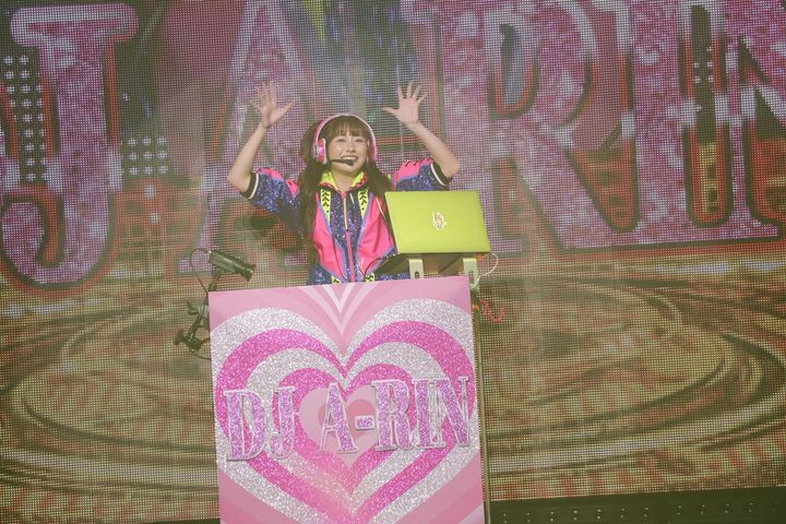 会場が明るくなり目に飛び込んできたのは、ビビットカラーのパーカーをまといヘッドフォンをつけた「DJ A-RIN」でした!