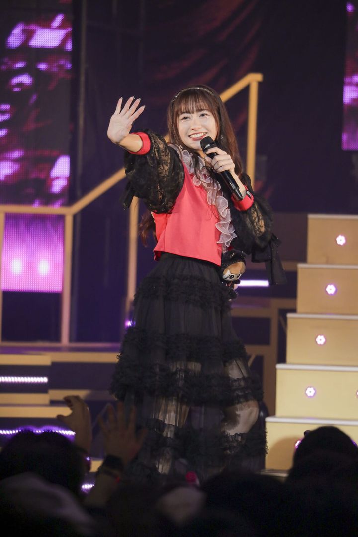 待望のアンコールに応えてステージに舞い降りたあーりんは、アイドルらしいふりふりの衣装にお色直し。開演時とおなじピンクと黒の配色が、「VIP ROOM A+」の世界観を印象づけます。ダウンスタイルにカチューシャをつけた髪型もとってもキュート!