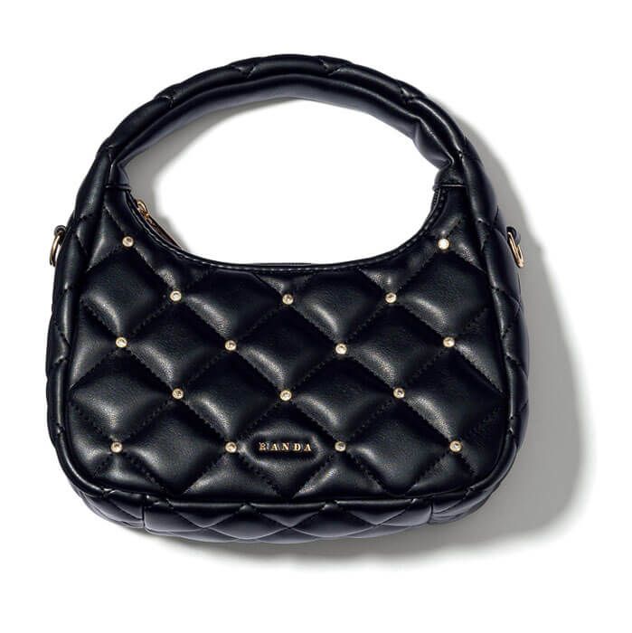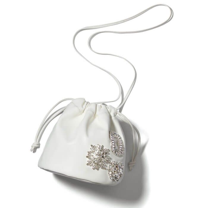 スムースな白のエコレザーとモード感漂うビジューの装飾で、カジュアルな巾着バッグをスタイリッシュに一新。