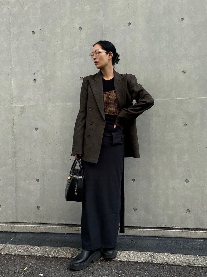 「ブラウンとブラックなカラーでシックにまとめてみました。シンプルすぎないようにオーバーサイズのジャケットや、デザイン性のあるスカート、そしてニットビスチェを合わせて遊び心を足してみました」