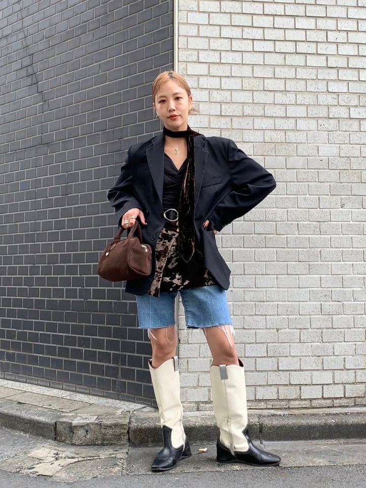 「ベーシックなジャケットなので、小物使いで遊び心をプラスしました。切りっぱなしのハーフデニムやウエスタン調のブーツを合わせて、きれいめなジャケットを自分らしく着こなしています」